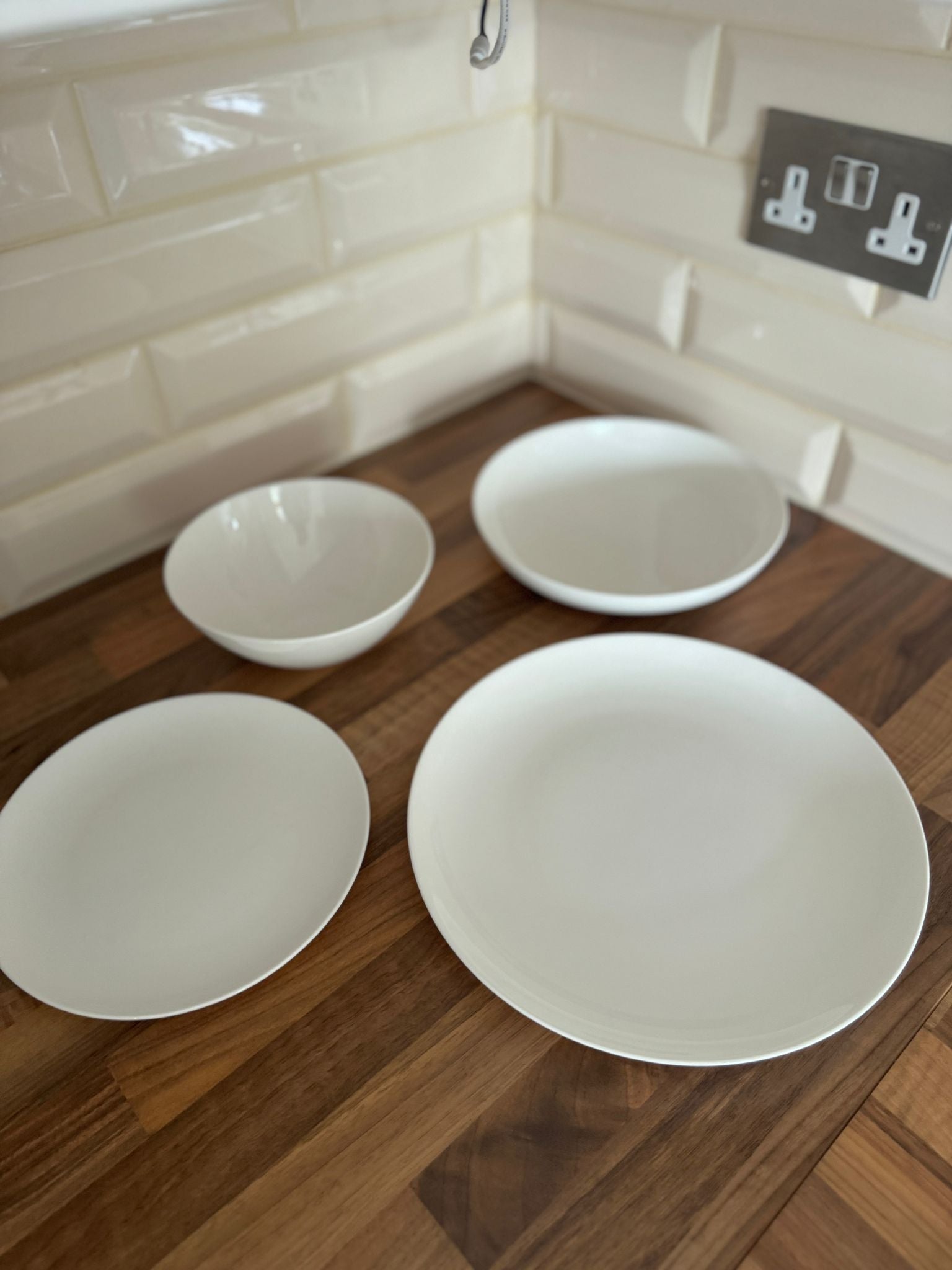 Dinner fork, spoon, table knife, teaspoon (6 pieces each).