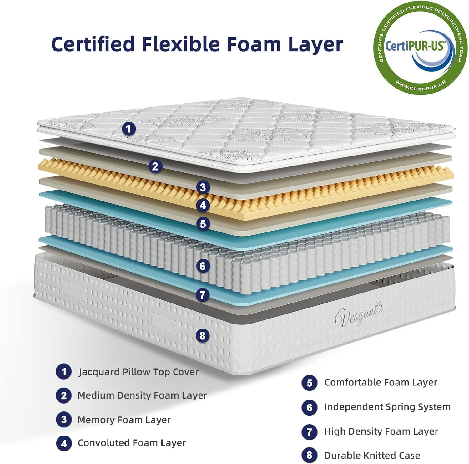- ăMedium to Firm Mattressă- Designed with layers of CertiPUR-US certified foam and hundreds of individual pocket springs, Vesgantti mattress is soft enough to be comfortable yet firm enough to be supportive. An ultra-quiet hybrid mattress for side, back and stomach sleepers
